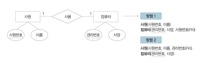앞에서 본 관계 대응수의 경우: 관계에 참여하는 최댓값을 기준으로 분류된다. 하나의 관계가 존재할때 그 관계에 참여하는 수가 최대 1개-1개여야 일대일이 된다. 이때 어떤 사원이 컴퓨터를 아직 받지 못한 상황도 가능하다.