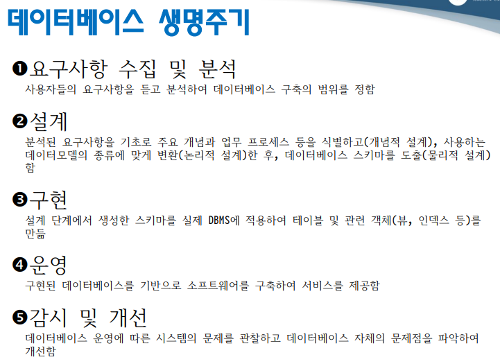 1) 요구사항 수집 및 분석: 데베를 만들기 전에 선행되어야 함. 사용자의 요구사항, 만드는 사람이 아니라 '사용할 사람'의 요구사항을 듣는 것. 어떤 데이터, 기능을 필요로 하는지, 어떤 방식 및 규모로 구축할지. 요구사항 명세서를 작성한다.