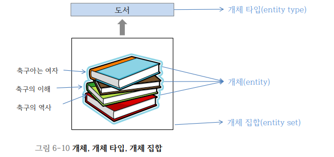 우리가 도서라는 개념이 있다면, 축구하는 여자/축구의 이해/축구의 역사 각각은 객체 - 엔티티라고 보면 된다. 각 도서가 각 객체가 된다. 이들을 하나로 정의하면 도서가 되고 이것을 엔티티 타입 - 객체 타입이라고 본다. 개체와 객체 타입이 혼용되어 사용되지만, 보통 객체라고 부를 때는 객체 타입을 의미하는 경우도 많다.