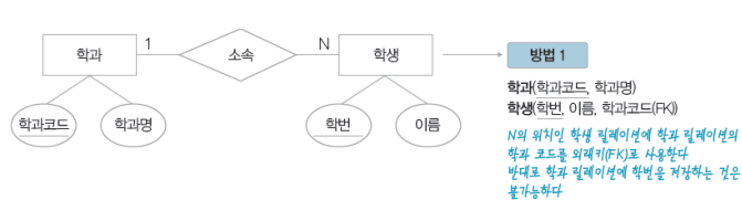 n이 어디있느냐가 중요하다. 기본적으로는 1쪽에 있는 기본키를 n쪽으로 가져와서 왜래키로 가져와서 포함시키는게 기본이다. 이 경우, 학과는 그대로 있지만 - 학과코드 기본키를 외래키로 가져와서 학생에 넣는다.