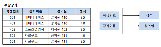 예를 들어 학생번호와 강좌이름이 기본키라면, 이 두개는 성적과 강의실을 결정한다. 그리고 이 둘이 합쳐져야 성적은 의미가 있다. 그런데 강의실은 강좌이름만 주어져도 결정될 수 있다.