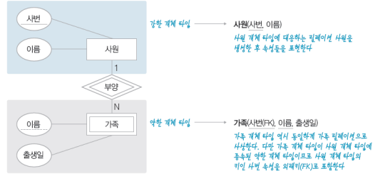 강한 개체 타입 참조가 필요. 약한 개체 타입이 보유한 식별자 + 상위개체의 기본키를 외래키로 가져와서 (FK)(=왜래키) 두개를 합쳐다가 기본키로 지정한다. 강한 개체가 있어야지만 약한 개체는 의미가 있기 때문에 이렇게 포함한다.