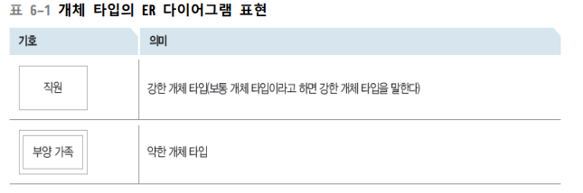 - ER에서 객체를 표현할때는 직사각형으로 표현. 객체에는 두 종류가 있어서 구분. 강한 객체 타입, 약한 객체 타입으로 분류. 약한 개체 타입이 아닌 애들은 전부 강함. 강한 애들은 다른 애들의 도움 없이도 독자적으로 존재가 가능한 것을 말한다. 직원이라는 것을 독자적으로 존재할 수 있다.