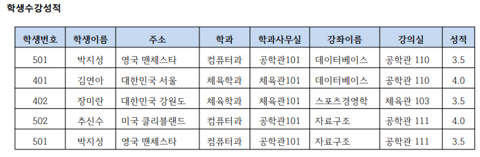 다음 테이블은 두개의 정보가 섞여있다. 학생번호 - 주소까지 학생정보, 강좌이름 - 강의실까지 강좌정보.
