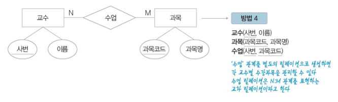 방법 4를 사용한다. 관계를 아예 새로운 릴레이션으로 만드는 것. 수업이라는 관계를 새로운 릴레이션으로 만들어 양쪽의 기본키를 가져와서 합쳐 기본키로 설정한다.