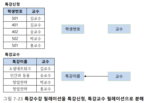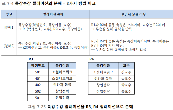 방법2) 공통속성은 특강이름이지만, 특강이름은 키가 아니다. 학생번호가 키이고, 교수가 키이다. 즉 무손실 분해 규칙을 만족하지 않는다.