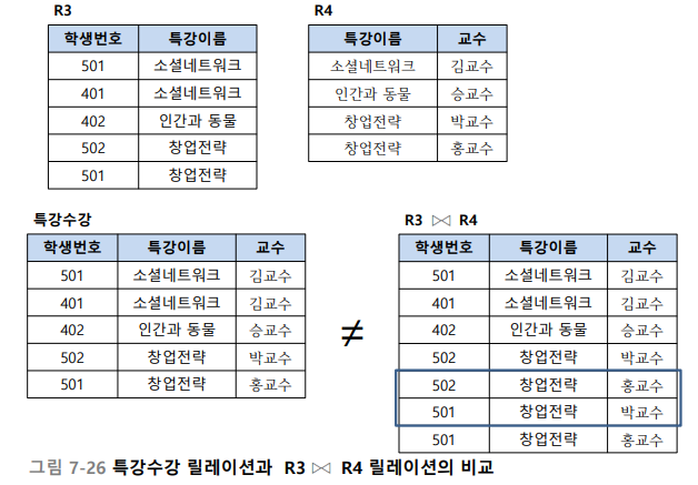이 경우, R3와 R4는 그렇게 문제가 없어 보이지만, 둘을 조인했을 때 원래의 릴레이션이 만들어지냐의 문제가 발생한다. 둘을 조인하면 의미없는, 기존에 있지 않았던 투플이 발생해버린다.