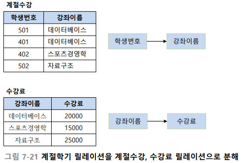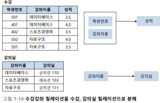 - 정규화: 릴레이션을 분해하여 이상현상을 없애는 과정.