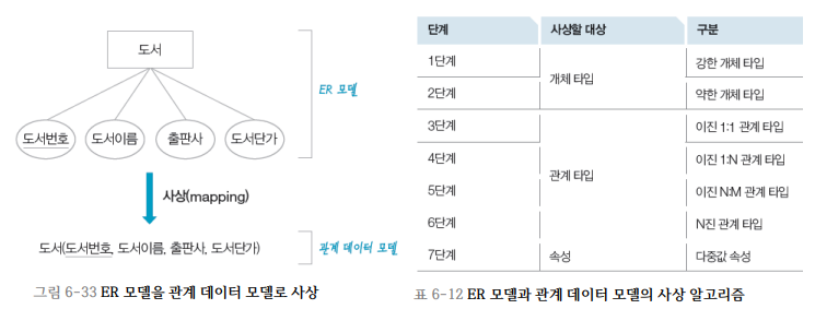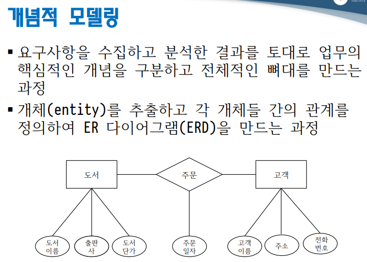 그림을 보면 도서라는 개체, 고객이라는 개체가 있을 때 도서 이름, 출판사, 단가 등의 속성들이 있어 정보들이 있는 것. 고객 또한 이름, 주소, 번호 존재. 고객이 일반적으로 도서를 주문한다 - 개체들 사이에 주문이라는 관계가 존재한다. 이렇게 개념적으로 모델링을 하는 단계.