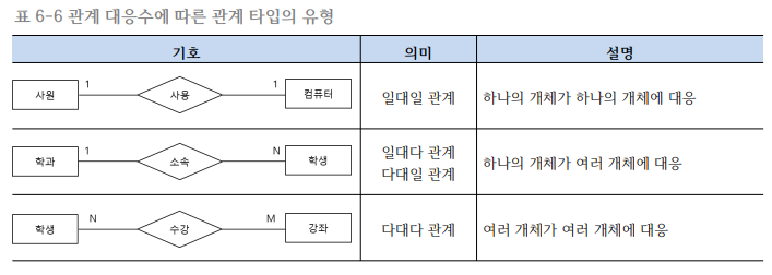 2) 다대일/일대다 관계: 하나의 개체가 여러 개체와 대응. 예를 들어 학생은 학과 하나에만 소속, 학과에는 여러명의 학생 소속.