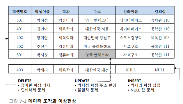 삭제를 했을 때, 삽입을 했을 때, 수정을 했을 때 이상이 존재한다.