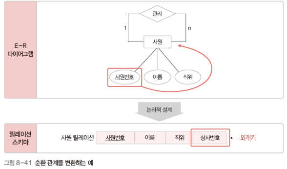 순환관계에서도 일대다 가능. 1쪽에 있는 애를 n쪽으로 가져와서 외래키로 추가.
