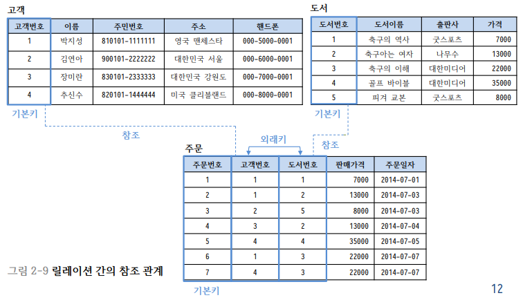 외래키는 무엇인가. 주문이라는 것은 고객과 도서의 관계이다. 1번 고객과 1번 도서의 관계가 무엇이냐 하면: 박지성이 축구의 역사라는 도서를 구매했을때 판매가격/주문일자를 기록하는 것. 이때 고객에 대한 정보/도서에 대한 정보를 참조하기 위해서 사용되는 게 "외래키"이다.