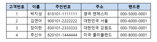 고객번호가 없다고 가정했을 때, 주민번호를 기본키로 선정한 경우 - 데베를 조인할때 기본키를 가지고 조인한다. 이때 조인할때마다 주민번호를 활용한다면: 여기저기 사용되면서 보안적으로 문제가 발생할 수 있다.