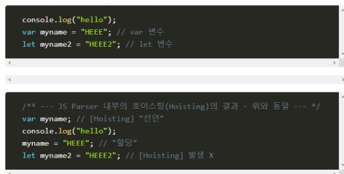 모든 선언은 선언/할당하는 부분이 각자 있다. 예시에서는 var myname은 변수 선언, myname = "HEEE"; 로 변수 할당.