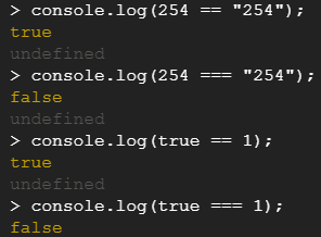 에서 == 1의 경우 true(타입 변환을 하니까), ===1의 경우 false(타입이 다르니까).